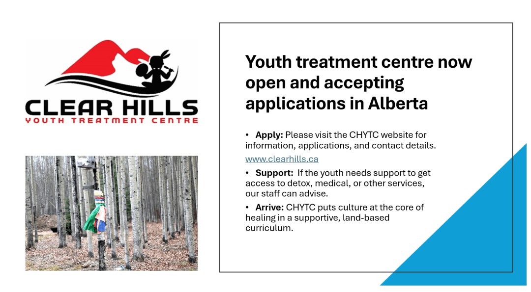 The new Clear Hills Youth Treatment Centre is now open and accepting applications. This culturally rooted centre focuses on land-based learning and traditional teachings for Indigenous youth. For more information, please visit http://www.clearhills.ca.